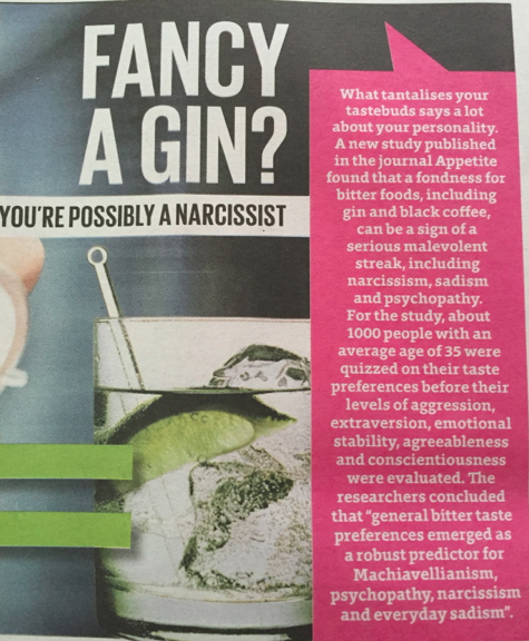 I read today (in the paper, so it must be true) that people who like gin are likely to be nasty – narcissistic, sadistic, psychopathic. Machiavellian. Not just gin, but all kinds of bitter flavours, such as coffee.