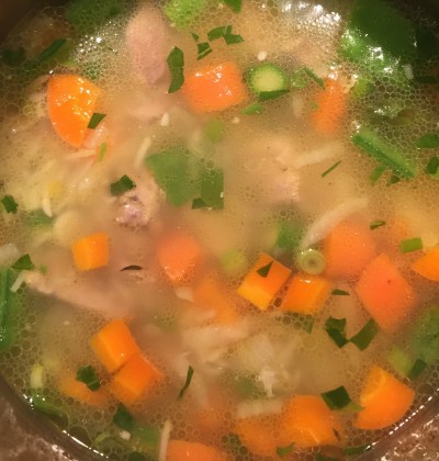 Well, I had a cold and so did Dave. At a particularly inconvenient time, just before Christmas. I grabbed the leftover bones of a roast chicken we had at the weekend and put them in a pot, along with with the leftover and carefully stored juices of that roasting.