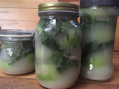 The recipe says to layer whole tart cooking apples in a gallon jar. With each layer, put in a layer of sour cherry leaves and tarragon, and keep layering until it’s full. I did not have gallon jars, so I used what I had. In one narrow jar I have three whole apples (three layers). In the others I have mostly halves and a few quarters.