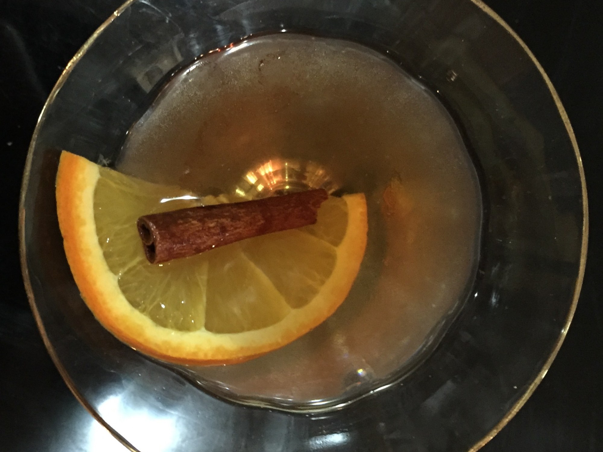 You can add either a half slice of orange, or a twist of the orange skin, and a half stick of cassia bark.