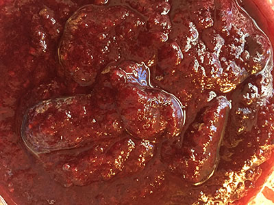 Let it reduce a bit until it has a thick, firm consistency. I ended up with about 4 cups of preserves, so I reduced it overall by about 1/3.