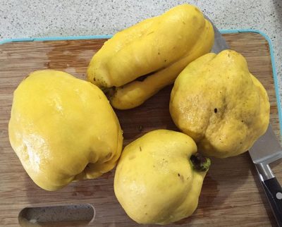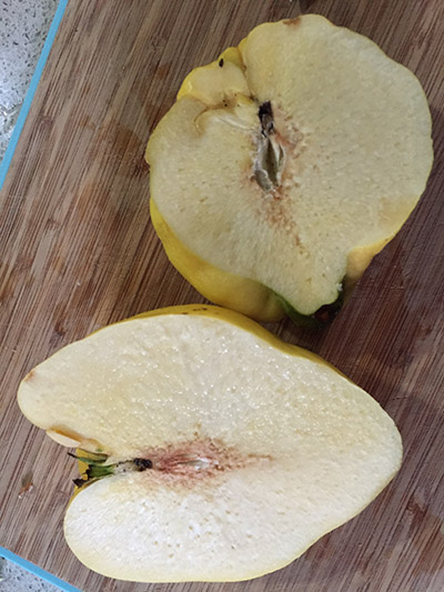 Chop up some apples similarly, but no more than 1/3 the quantity of quinces. You want the quinces to dominate.