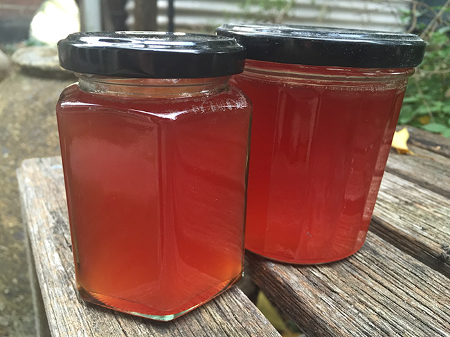 Don’t stop the boiling until you see clear signs that it’s starting to set. And once you do, stop. You can overcook it too, and you won’t get a jelly out of that. (I did that with feijoas one time – it’s one of those fruits that you apparently have to bottle long before it shows any sign of setting, and it sets in the jar over the next couple of days. I had no idea. I waited and waited for signs of it setting and ended up with an intense dark paste. Delicious in its own way, but not at all what I was after).
