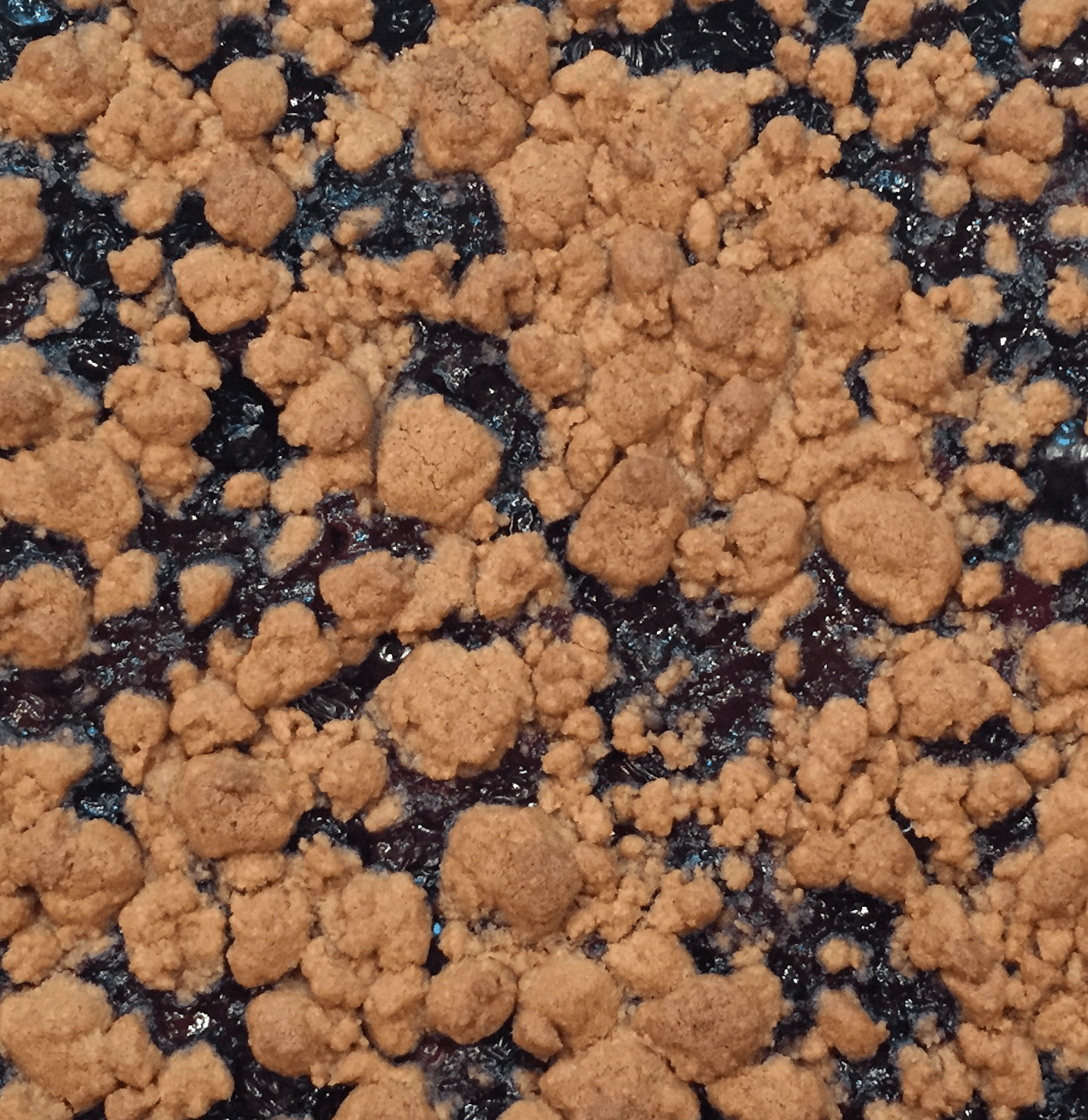 Top the base with a good layer of your chosen fruit (mine was blueberries). Top with streusel. You can certainly choose to have more streusel on top, but for me the ideal is the fruit peeking through.