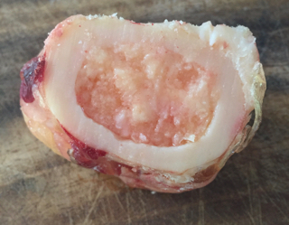 First get some beef marrow bones from your butcher. You want all of it including the ends (I had a couple of large bones cut into pieces), but the main bits full of marrow should be cut into short lengths.