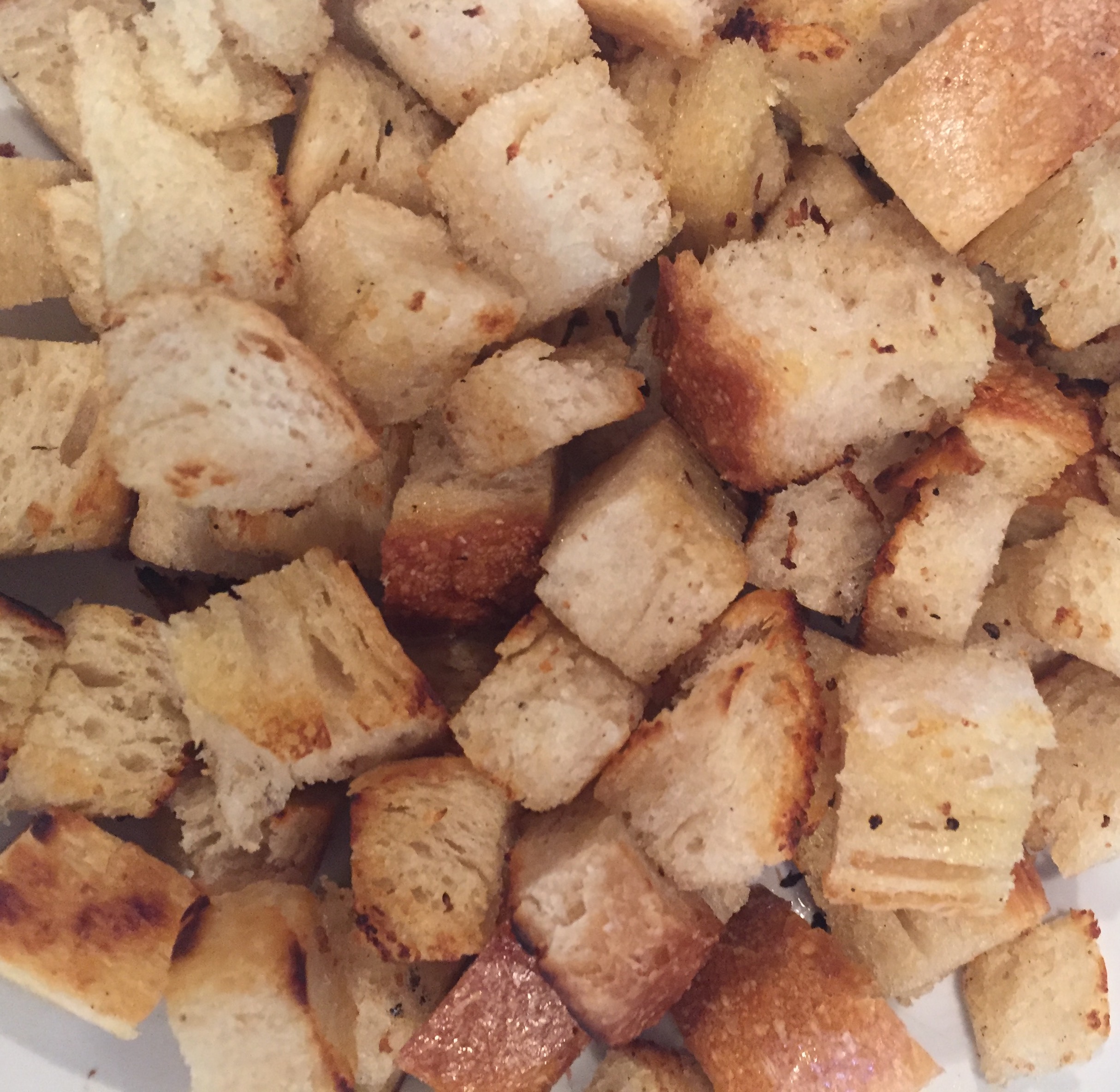 Cut the bread into small cubes, about 1cm is good. Fry them in butter until they are a little brown.