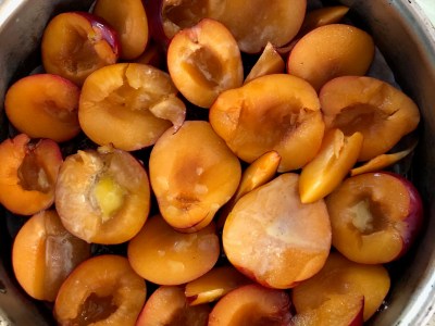 • Cut the plums in half and put in a tight layer across the bottom of the pan, skin side down. The original calls for blood plums, but I just used what I had.