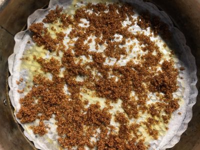 • In the bottom of the cake tin, pour 50g of melted butter, and sprinkle the brown sugar across.