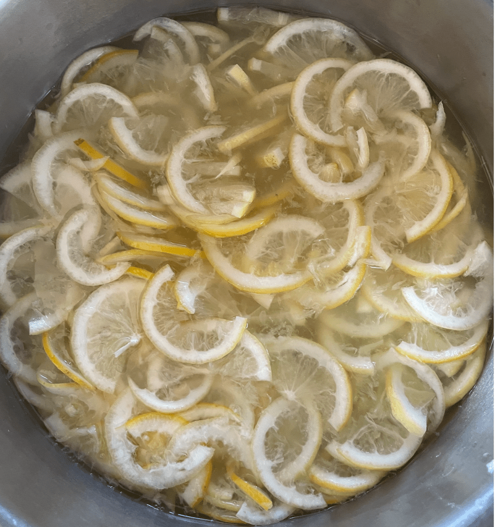 1) Cut the end off the orange, then cut in half end to end, and then slice thinly into half-moons and place fruit and any juice into a large saucepan. Discard the ends of each piece of fruit. Do the same to all your fruit. I usually do double or even triple this amount without any problem.